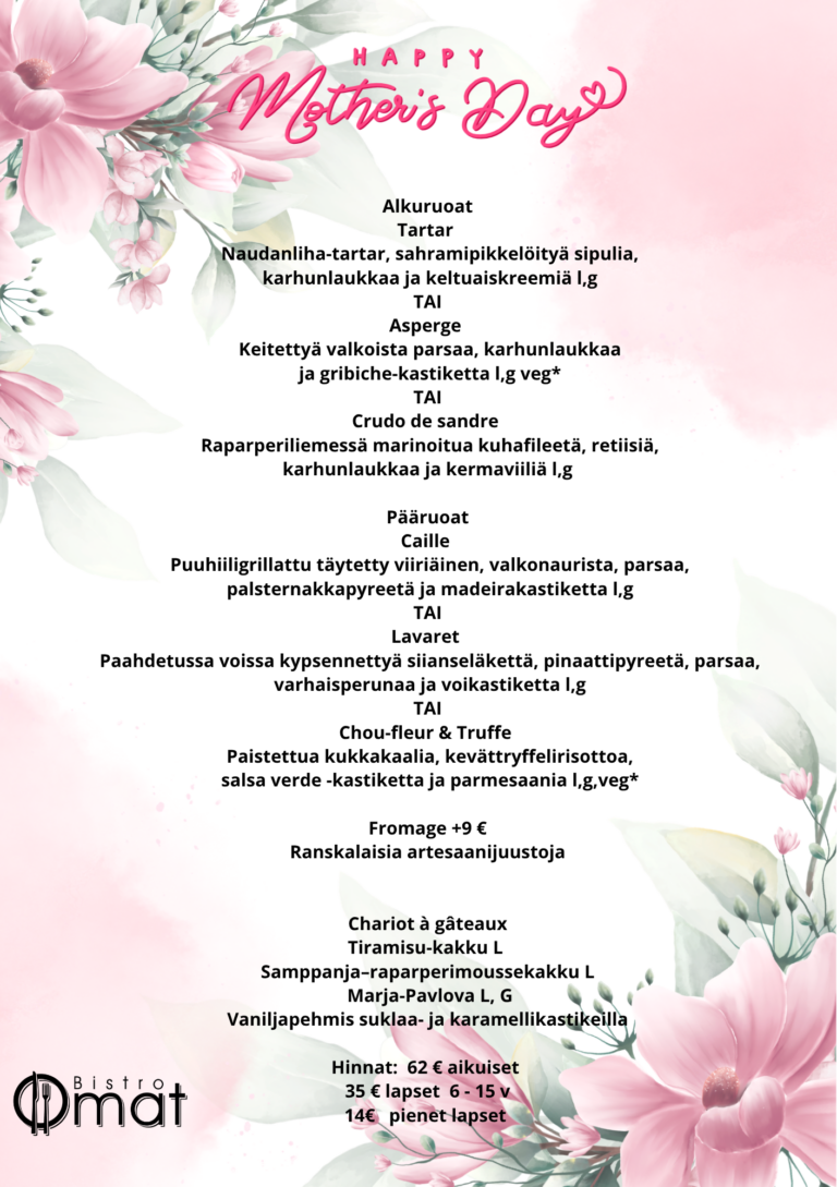 Keittiömme on luonut äitienpäiväksi menun, jossa kevään raikkaat maut, huolella valitut raaka-aineet ja klassiset ranskalaiset vaikutteet kohtaavat. Valittavana on kolme alkuruokaa, kolme pääruokaa sekä upea valikoima talon omia leivonnaisia ja kakkuja jälkiruoka pöydästämme.